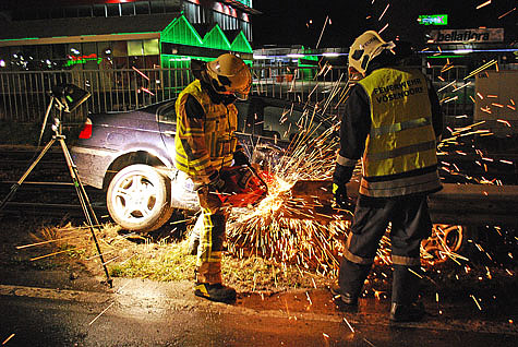 Die demolierte Leitschiene musste mit einem Trennschleifer durchtrennt werden. Nach über zwei Stunden konnten die 12 Mann und 3 Fahrzeuge wieder ins Feuerwehrhaus einrücken.