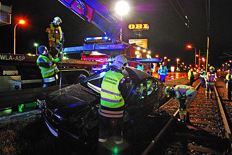 Am Abend des 09. November 2013 ereignete sich im Gemeindegebiet von Vösendorf ein Unfall mit weitreichenden Folgen. Aus ungeklärter Ursache kam ein PKW von der Fahrbahn ab und krachte frontal gegen eine Leitschiene, durchbrach diese und kam mit dem linken Vorderreifen am Gleiskörper der Wiener Lokalbahn zu stehen. Der 28jährige Fahrzeuglenker konnte sich selbstständig aus seinem verunfallten PKW befreien.