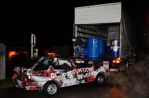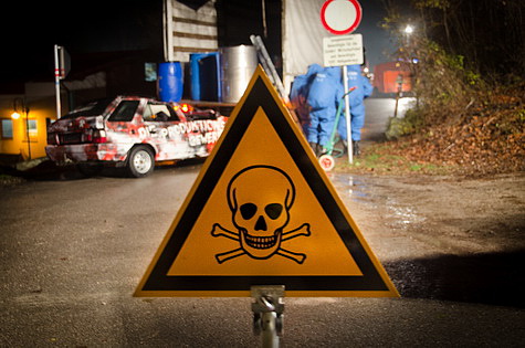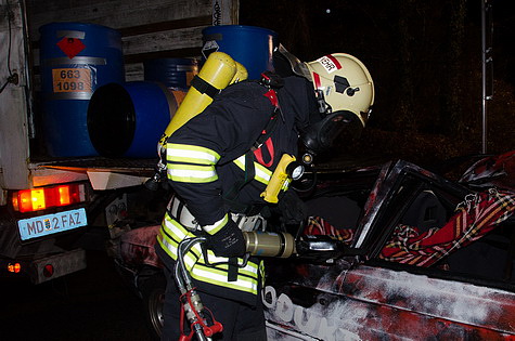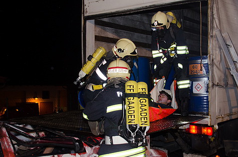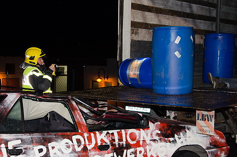 Während des Abladevorganges eines Gefahrenguttransporters krachte ein mit zwei Personen besetzter PKW in das Heck des LKW's. Der Aufprall war so heftig, dass die Fahrzeuginsassen im Auto eingeklemmt wurden, der LKW Fahrer das Bewusstsein verlor, und zahlreiche Fässer des Gefahrenguttransportes umfielen bzw. Leck schlugen.