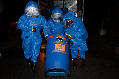 Durch die im Gefahrenbereich eingesetzten Schutzanzugtrupps konnten alle beschädigten Fässer verschlossen bzw. geborgen werden. Nach erfolgreicher Dekontamination aller im Wirkbereich des Schadstoffs eingesetzten Kräfte und Gerätschaften konnte das Übungsziel erreicht und die Übung als beendet erklärt werden.
