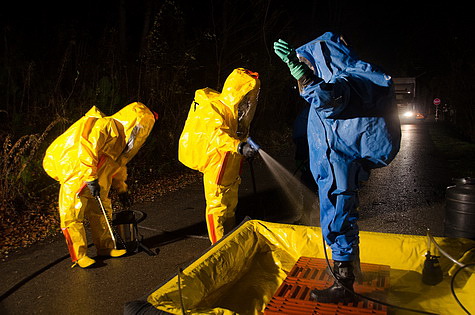 Fast zeitgleich trafen die Mitglieder des Schadstoffberatungsdienstes sowie die Einsatzelemente des Schadstoffzuges am Übungsort ein, sofort wurde eine kurze Lagebesprechung mit dem örtlichen Einsatzleiter gemacht, drei Trupps mit Schutzanzügen der Klasse 2 und 3 ausgerüstet sowie ein Dekoplatz errichtet.