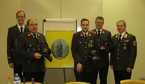 Nach einem Jahresrückblick und Ansprechen erhielten die neuen Absolventen des Sprenglehrganges, LM Stefan Varga (FF Hennersdorf), LM Marco Kreuzer (FF Maria Enzersdorf) und LM Georg Schörgendorfer (FF Laab im Walde) ihre Dienstkappen und Poloshirts der Sprengdienstgruppe 14 überreicht.