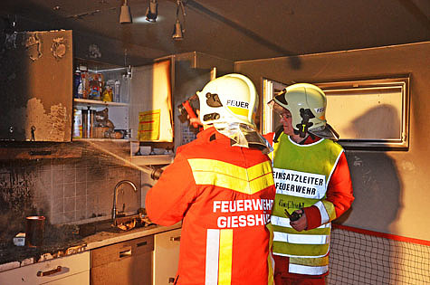 Küchenbrand mit einem Rohr und Atemschutz gelöscht