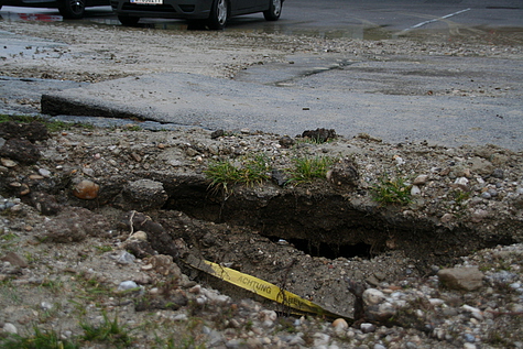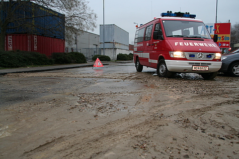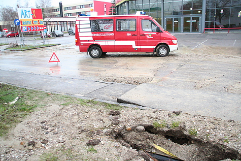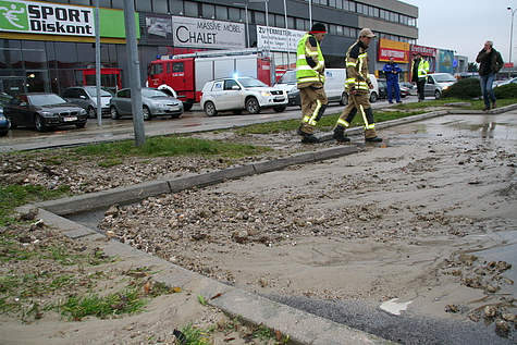 Dem Einsatzleiter, Kommandant-Stellvertreter der BTF SCS Rudolf Lahmüller, bot sich folgendes Bild: Die enorme Gewalt beim Rohrbruch verursachte ein tiefes Erdloch in einem Grünstreifen, das Anheben der Betonplatten am Gehweg, sowie die Unterspülung der Fahrbahn. Außerdem jede Menge Schlamm und Geröll, was die gesamte Umgebung für den Straßenverkehr unbenutzbar machte. Um ein regelrechtes Verkehrschaos in der Vorweihnachtszeit zu vermeiden, veranlasste der Einsatzleiter eine großräumige Absicherung bzw. Absperrung des Umfeldes.