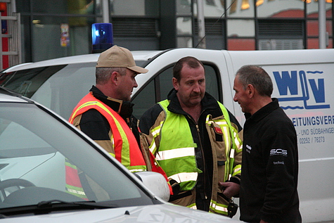 Zusammen mit dem Technik-Team der SCS-Verwaltung kontrollierte man den nahegelegenen Pumpenraum. Von dort aus wird die betroffene 150mm-Leitung im normalen Betriebszustand mit 5bar Wasserdruck gespeist und die Sprinkleranlagen der umliegenden Geschäftsgebäude versorgt.