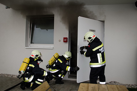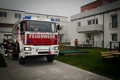 Da sich die Wohnhausanlage neben dem Feuerwehrhaus befindet, traf bereits wenige Minuten nach der Alarmierung das erste Tanklöschfahrzeug am Einsatzort ein.
