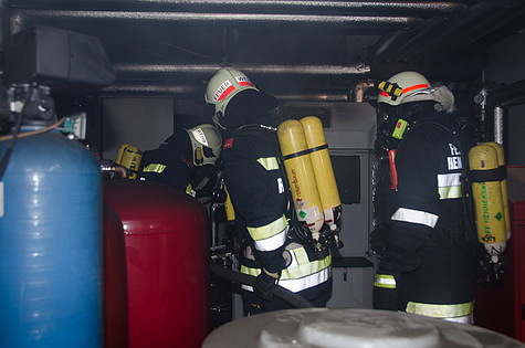 Als Erstmaßnahme wurde der vor dem Heizraum befindliche Not-Aus Schalter betätigt sowie die Feuerwehr Hennersdorf zur Unterstützung nachalarmiert. Während eine Löschleitung vorbereitet wurde, rüstete sich ein Trupp mit umluftunabhängigen Atemschutzgeräten aus.