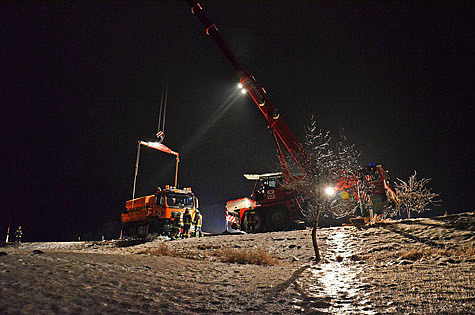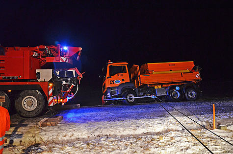 Mittels Kettengehänge konnte anschließend das Streufahrzeug angehoben und auf der Fahrbahn abgestellt werden. Nach erfolgreicher Bergung wurden am LKW Ketten aufgezogen, um eine sichere Weiterfahrt zu ermöglichen.