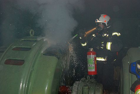 Zeitgleich wurde eine 100 Meter lange Angriffsleitung in die Halle verlegt und zwei Hochleistungslüfter in Stellung gebracht. Um jedoch den Wasserschaden möglichst gering zu halten, entschied die Einsatzleitung zusätzlich drei Handfeuerlöscher zum Brandherd mitzunehmen.