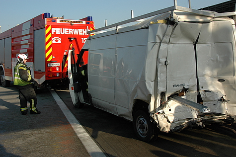 Denn durch die Wucht des Aufpralles, verkeilte sich der Kleinbus mit der Vorderachse in die Leitschiene. Eine geladene Aluschiene durchbohrte die hintere Türe und blieb im nachfahrenden LKW stecken.