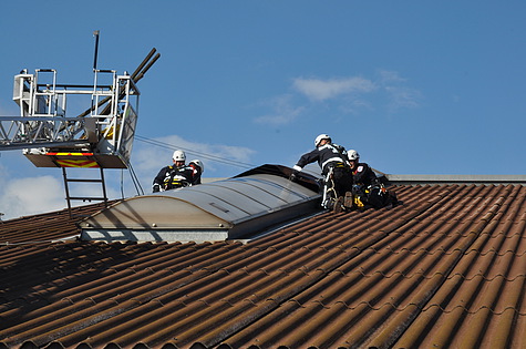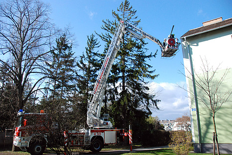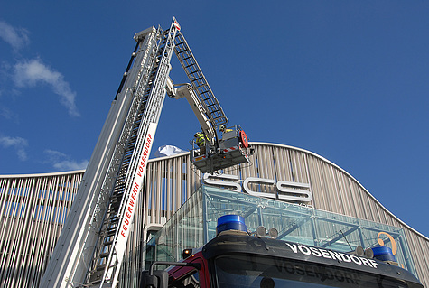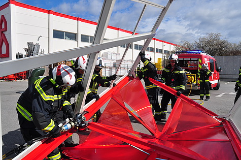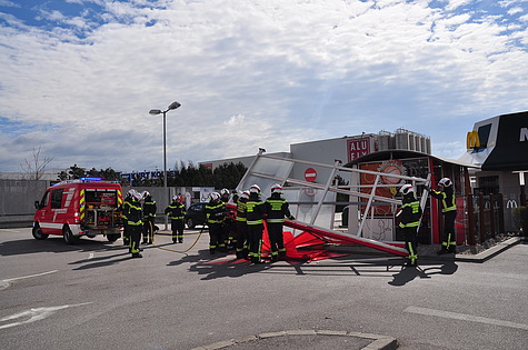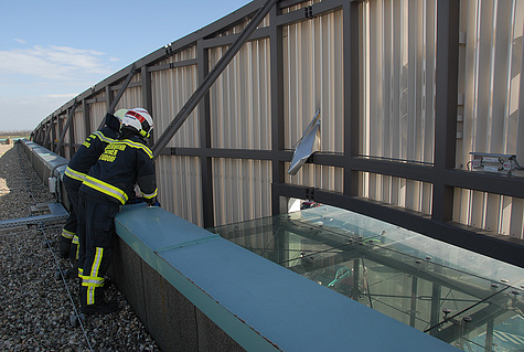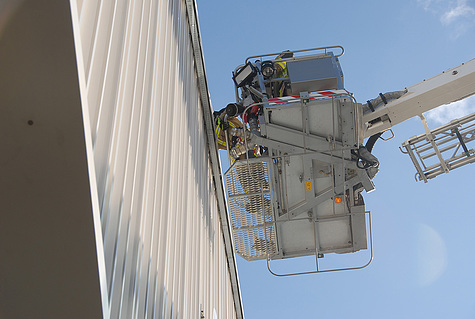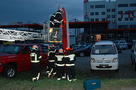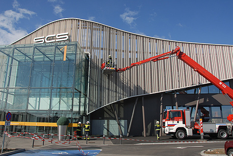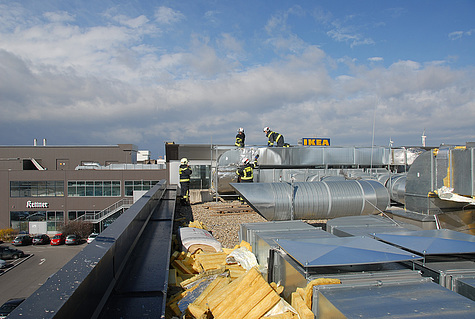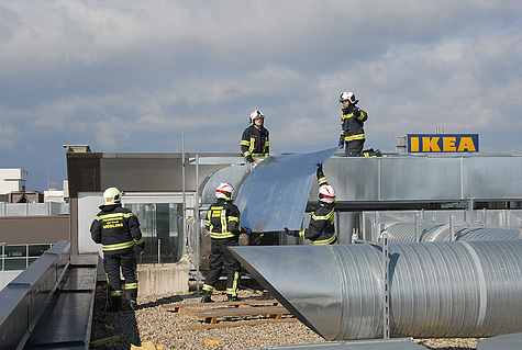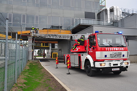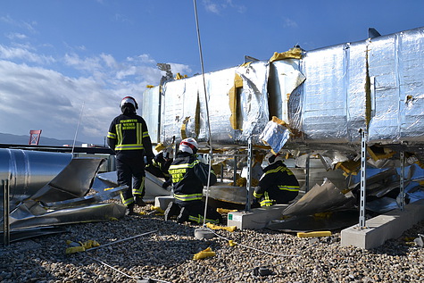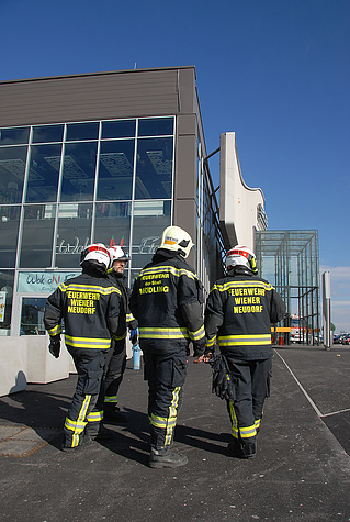 Den wohl aufwändigsten Einsatz gab es am Areal der SCS. Eine ca. 60m² große Fassade drohte abzustürzen. Bei diesem Einsatz waren insgesamt vier Feuerwehren mit zwei Hubrettungsgeräten im Einsatz.