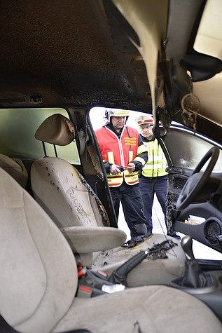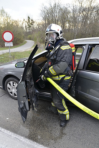Sofort wurde eine Löschleitung vorbereitet und der Atemschutztrupp in den Einsatz geschickt. Nach dem Öffnen der Beifahrertüre wurde der Brand durch zwei kurze Sprühstöße mit dem Strahlrohr gelöscht. Nach dem Öffnen aller Fahrzeugtüren und Abzug des Rauches zeigte sich rasch das Ausmaß der Brandes – ein völlig zerstörter Innenraum des Citroën.