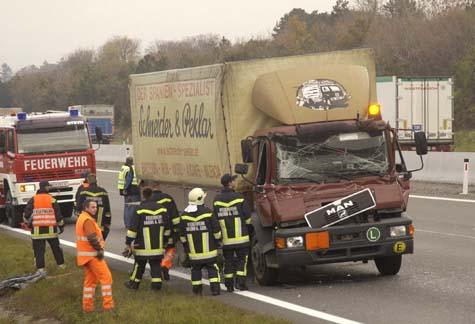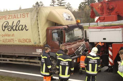 Auf Höhe der Ausfahrt Gießhübl in Fahrtrichtung Westen blieb zunächst ein tschechischer Lkw aufgrund eines Motorschadens auf der ersten Fahrspur liegen. Starke Rauchentwicklung raubte dem Lenker des nachfolgenden Gefahrguttransporters die Sicht, er fuhr mit seinem Lkw auf das stehende Fahrzeug auf. Beim Anprall wurde das Führerhaus schwer beschädigt, der Lenker erlitt einen Beinbruch. Um 9.20 Uhr wurde die Freiwillige Feuerwehr Brunn am Gebirge von der Bezirksalarmzentrale Mödling zum Einsatz auf die Autobahn alarmiert. Bei der ersten Meldung war wegen der Rauchentwicklung von einem Fahrzeugbrand die Rede. Dies stellte sich jedoch glücklicherweise rasch als Fehlinformation heraus. Das Fahrzeug hatte neben verschiedenen anderen Waren 1000 Liter Schwefelsäure geladen. Obwohl sich die Ladung am Fahrzeug beim Anprall verschob, blieb der Behälter mit der Schwefelsäule dicht. Von der Freiwilligen Feuerwehr Brunn wurden am Unfallort Sicherungsmaßnahmen durchgeführt. Der schwer beschädigte und fahrunfähige Gefahrguttransporter musste mit dem Feuerwehr-Kranfahrzeug Mödling entfernt werden.Bildautor: Pressestelle BFK Mödling/G. Bauer
