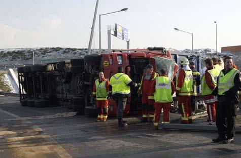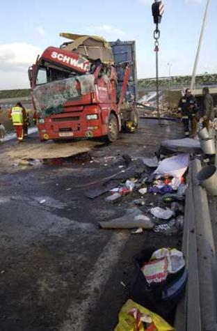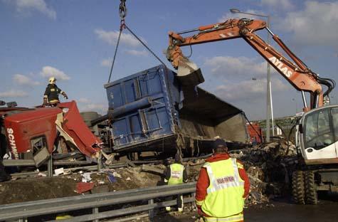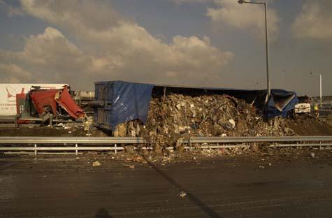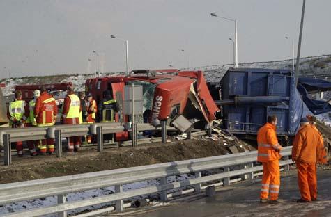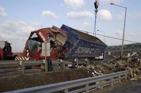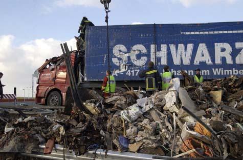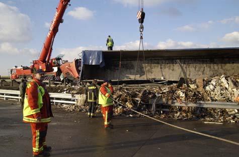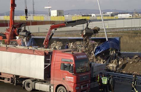 In der Rechtskurve der Auffahrtsrampe auf die A 21 war in den Vormittagsstunden ein 38 Tonnen schwerer Sattelschlepper umgestürzt. Dabei erlitt der Lkw-Lenker Verletzungen unbestimmten Grades, er wurde vom Roten Kreuz ins Krankenhaus eingeliefert. Das Fahrzeug war mit Kunststoffmüll beladen. Zunächst wurde der Unfall bei der Feuerwehr-Bezirksalarmzentrale Mödling als Unfall mit Brand gemeldet. Es stellte sich jedoch heraus, dass beim umgestürzten Fahrzeug lediglich Öl auf den heissen Auspuff getropft ist und dadurch starke Rauchentwicklung entstand. Bevor die Feuerwehr mit dem Aufstellen des umgestürzten Sattelzuges beginnen konnte, mussten zunächst 90 Kubikmeter gepressten Mülls - insgesamt 23 Tonnen -aus dem Ladecontainer entfernt werden. Diese Arbeiten wurden von zwei Ladekränen mit Greifer und einem Bagger erledigt. Glück im Unglück: die noch nicht eröffnete Trasse der S1 direkt neben der Unfallstelle diente als ideale Manipulationsfläche. Nach dem Entladen des Sattelschleppers musste der Hydraulikstempel des Containers eingefahren werden. Durch perfektes Zusammenspiel zwischen Feuerwehrkran und Bagger konnte diese schwierige Aufgabe in kurzer Zeit bewältigt werden. Das Aufstellen des Fahrzeuges bewerkstelligte die Feuerwehr in professioneller Manier. Gesichert durch die Seilwinde des Großtanklöschfahrzeuges Wiener Neudorf stellte der Feuerwehrkran den umgestürzten Sattelschlepper behutsam wieder auf die Räder. Die Zugmaschine wurde anschließend vom Kranfahrzeug abgeschleppt, den fahrfähigen und abgesattelten Auflieger übernahm ein Fahrzeug des betroffenen Transportunternehmens. Um 15 Uhr war der mehrstündige Feuerwehreinsatz beendet. Die Einsatzstelle wurde der Straßenmeisterei für die weiteren Aufräumungs- und Sicherungsmaßnahmen.Bildautor: Pressestelle BFK Mödling, BR Gottfried Bauer