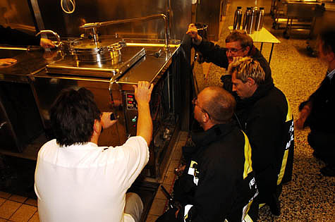 Nach Ausdehnung der Inspektionen auf die über dem Aggregatraum im Erdgeschoss liegende Krankenhausküche konnte schließlich der kuriose Grund der Verqualmung ermittelt werden: Dort war bei einer Groß-Kaffeemaschine ein Behälter leck geworden, aus diesem Gefäß traten heller Rauch und eine ölige Flüssigkeit aus. Dieser stechend riechende Rauch war offensichtlich schwerer als Luft und drang durch bestehende Öffnungen vom Küchenbereich in das darunter liegende Kellergeschoss. Das Gerät mit dem schadhaften Behälter wurde von Haustechnikern sofort außer Betrieb genommen.