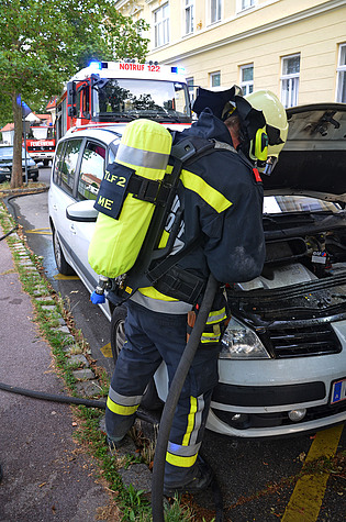 Am 7. Juli 2014 bemerkte ein Autolenker während seiner Fahrt durch Maria Enzersdorf , dass sein PKW plötzlich sehr schwer lenkbar ist. Er stellte das Kraftfahrzeug daher sofort in die nächste Parkplatzbucht der Josef Leeb Gasse und merkte in diesem Moment, dass Rauch aus dem Motorraum dringt. Über sein Mobiltelefon wählte er den Feuerwehr Notruf. Die Feuerwehr Maria Enzersdorf wird um 19.47 zu diesem Einsatz alarmiert. Ein Atemschutztrupp öffnet die Motorhaube und beginnt mit den Kühlarbeiten. Währenddessen teilte der Autobesitzer dem Einsatzleiter BI Girts Hartmanis mit, dass die Feuerwehr Maria Enzersdorf bereits zum zweiten Mal innerhalb von einem Jahr sein Kraftfahrzeug löscht. Nach einer halben Stunde Kühlung des stark überhitzten Motorraums, unter ständiger Kontrolle mittels Wärmebildkamera, konnte der Einsatz beendet werden. Die Ursache für diesen zweimaligen Vorfall innerhalb von einem Jahr ist nicht bekannt. Der Besitzer meinte, er wird sich nun ein neues Auto kaufen.