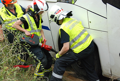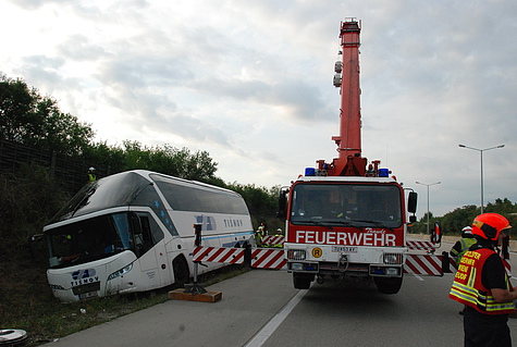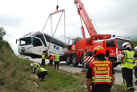 Für die Bergung des Reisebusses wurde das Kranfahrzeug der Feuerwehr Wiener Neustadt alarmiert. Nach Anschlagen der notwendigen Mittel, wurde der Bus zurück auf den Pannenstreifen gehoben.