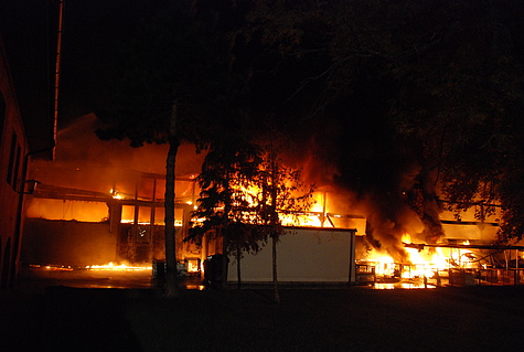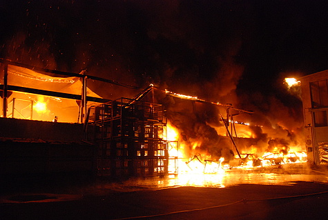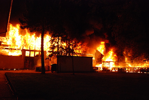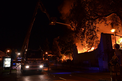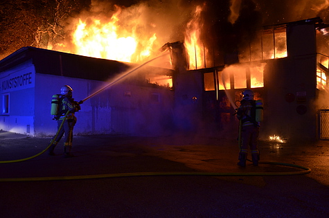 Trotz Dunkelheit konnte schon beim Ausrücken eine große Rauchsäule wahrgenommen werden. Am Einsatzort angekommen, wurde das Ausmaß des Brandes erst richtig sichtbar. Eine Fertigungshalle von rund 1.000 m² für sämtliche Kunststofffertigungen stand in Vollbrand.