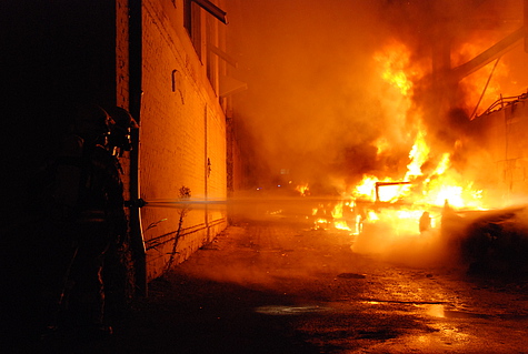 Die Feuerwehr Wiener Neudorf wurde in der angrenzenden Mühlgasse positioniert um von der Hinterseite des Industrieobjektes mit den Löscharbeiten fortzusetzen. In weiterer Folge wurde ein umfassender Außenangriff mit mehreren C- und B-Rohrer unter Atemschutz vorgenommen.