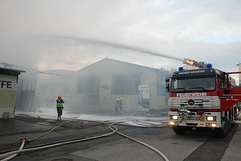 Sofort wurde von Einsatzleiter HBI Friedrich Flasar die Alarmstufe erhöht und die Feuerwehren Hennersdorf und Wiener Neudorf zum Brandeinsatz hinzugezogen. Als Erstmaßnahme wurde Steig Vösendorf in Stellung gebracht um mit dem Wasserwerfer von oben herab mit den Löschmaßnahmen zu beginnen.