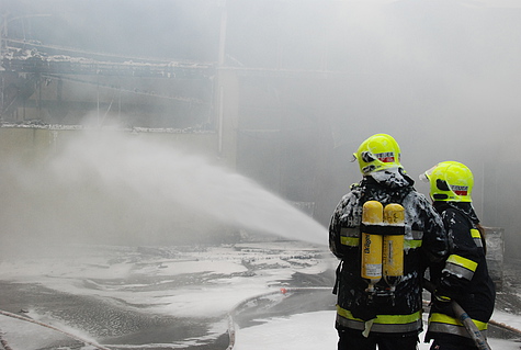 Nach rund zwei Stunden Dauerlöscheinsatz zeigten die getroffenen Maßnahmen Wirkung und der Brand konnte unter Kontrolle gebracht werden. Dann wurde jedoch vom Besitzer mitgeteilt, dass sich eine Acetylenflasche in der Halle befindet.