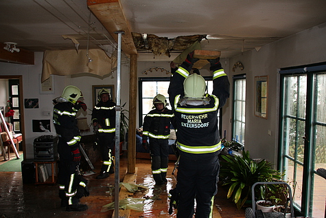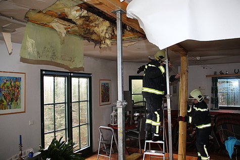 An der Einsatzstelle angekommen, stellte Einsatzleiter BI Girts Hartmanis fest, dass die Deckenkonstruktion, im Wohnzimmer, eines Ferienhauses eingestürzt ist und Wasser vom 1. Stock hinunterläuft.