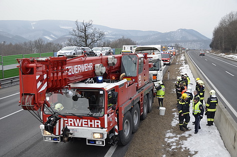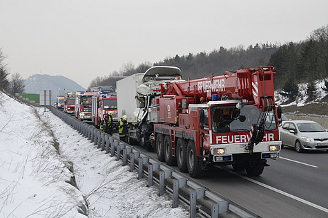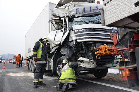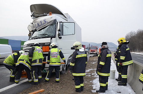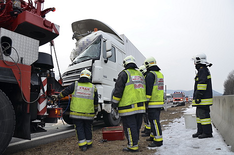 Ein Auffahrunfall zweier Lastkraftwagen auf der Wiener Außenringautobahn führte am Vormittag des 5. Februar zu einem mehrstündigen Feuerwehreinsatz.