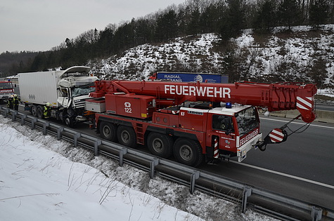 Im Anschluss daran konnte der LKW mit Hilfe des Kranfahrzeuges am Pannenstreifen bis zur nächsten Betriebsabfahrt geschleppt werden. Der verunfallte Tankwagen wurde ebenfalls durch die Feuerwehr bis zur Betriebsabfahrt begleitet. Nach etwas mehr als drei Stunden konnte der Einsatz für die 15 Feuerwehrmitglieder und fünf ausgerückten Fahrzeuge beendet werden.
