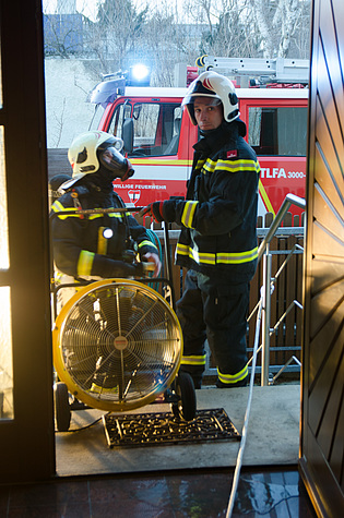 Außerhalb des Einfamilienhauses wurde ein Hochleistungslüfter in Stellung gebracht, und somit ein Überdruck im Gebäude erzeugt. Dieser Überdruck ermöglicht der Feuerwehr, dass die giftigen und heißen Brandgase über eine Ablüftöffnung rascher ins Freie gedrückt werden. Ebenso wurde die Gas- und Stromleitung durch die Feuerwehr unterbrochen.