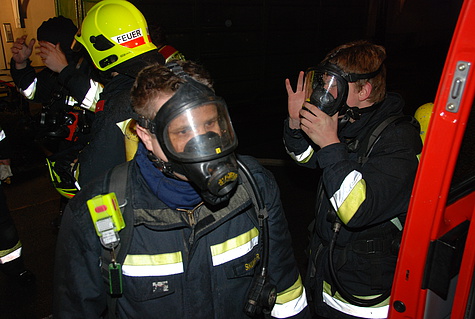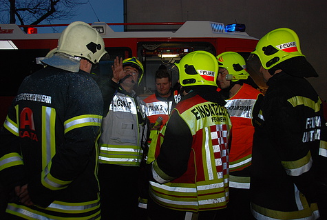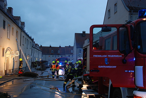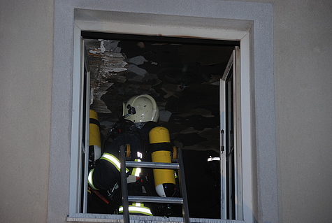 Gleichzeitig begab sich ein Atemschutztrupp der Feuerwehr Guntramsdorf mit einem C-Rohr zum Innenangriff ins Mehrparteienwohnhaus. Ein zweiter Atemschutztrupp begab sich mit einer Schiebeleiter in den 1. Stock.