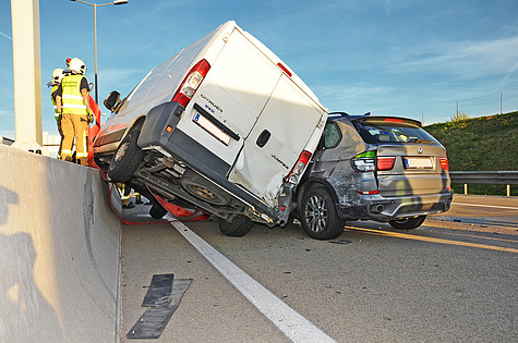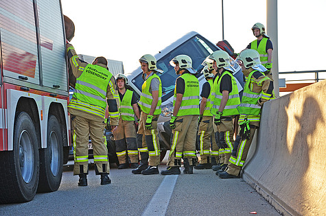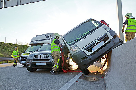Beim Eintreffen der Einsatzkräfte stellte sich ein kurioses Bild dar: drei Fahrzeuge dürften kollidiert sein, dabei stand ein Lieferwagen auf der Betonleitschiene und zwickte einen PKW unterhalb ein. Der Lenker des BMW konnte sich glücklicherweise selbständig über die Beifahrerseite befreien. Der zweite Lieferwagen blieb beschädigt dahinter stehen.