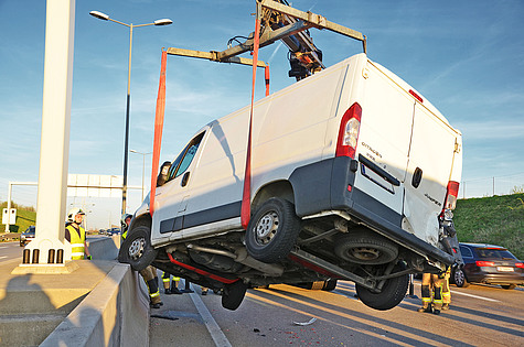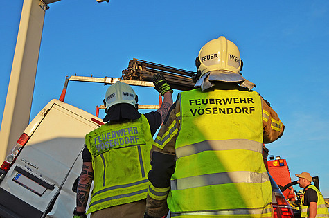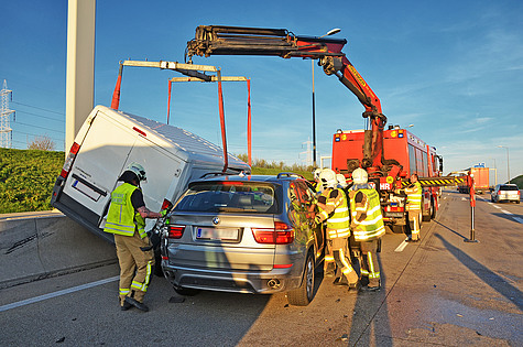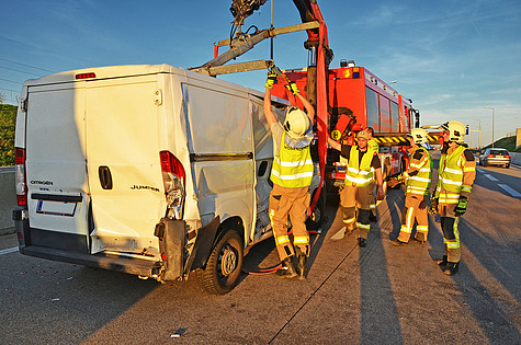 Mittels Kran und Diagonalhebekreuz vom Schweren Rüstfahrzeug hob die Feuerwehr Vösendorf den Lieferwagen von der Betonleitwand herunter. Anschließend wurden die beiden verunfallten Lieferwagen durch die Feuerwehr von der Autobahn entfernt. Der BMW konnte seine Fahrt selbständig fortsetzen.