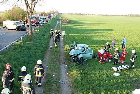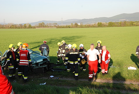 Beim Eintreffen der Einsatzkräfte stand ein Volkswagen auf der Straße und ein völlig zerstörter Fiat lag im Straßengraben, in welchem ein Mann eingeklemmt war. Die Mannschaft des Rüstlöschfahrzeuges Achau schaffte es, den Lenker händisch zu befreien.