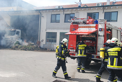 Beim Eintreffen der Einsatzkräfte am Wirtschaftshof stand der Grünschnittabfall in Brand und drohte auf einen LKW sowie das Gebäude überzugreifen. Ein Atemschutztrupp begab sich sofort mit einem HD-Rohr zum Schutz des Lastwagens vor.