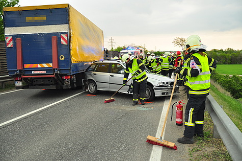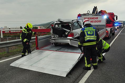 Zur Bergung eines Unfallfahrzeuges alarmierte der Einsatzleiter HBI Werner Wlaschitz das Wechselladerfahrzeug der Freiwilligen Feuerwehr Wiener Neudorf.