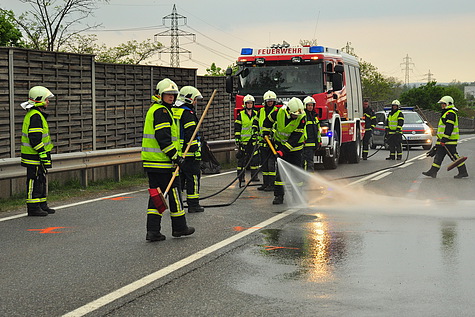 Nach Abtransport des Unfallfahrzeuges führte die Feuerwehr die provisorische Reinigung der Straße durch und rückte im Anschluss ein.