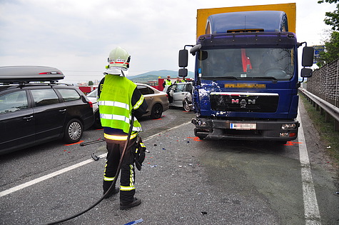 Nach Ankunft des Vorausfahrzeuges der Feuerwehr am Unfallort und Erkundung der langgezogenen Unfallstelle konnte Entwarnung gegeben werden, keine Person war in einem der Fahrzeuge eingeklemmt, zwei Personen jedoch verletzt.
