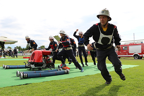 Um 13:00 Uhr wurde mit der Hissung der Bewerbsfahne auch der Bewerb für die Aktivegruppen eröffnet. Bezirksfeuerwehrkommandant LFR Ing. Richard Feischl begrüßte den Bürgermeister Josef Ehrenberger und zahlreiche Feuerwehrfunktionäre. Darunter die original Mannschaft der FF Münchendorf aus dem Jahre 1985. Damals gewann diese Gruppe den Landesbewerb in Stockerau. Die BFK-AFK Gruppe wurde von BFKDT Ing. Richard Feischl angeführt. Für den Aktivenbewerb waren 40 Gruppen gemeldet. Der Löschangriff erfolgte auf vier Wettkampfbahnen.