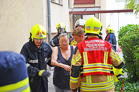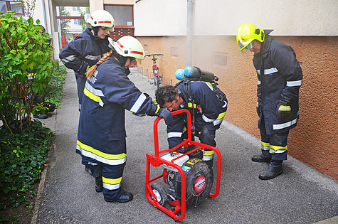Die Feuerwehr Vösendorf begann mit der Menschenrettung und parallel mit der Brandbekämpfung im Keller. Die Bewohner wurden mittels Fluchtfiltermasken durch Atemschutzgeräteträger ins Freie gebracht. Im Keller fanden die Feuerwehrmänner ein Kellerabteil im Vollbrand vor. Die Löscharbeiten gestalteten sich aufgrund der nicht vorhandenen Sicht und der extremen Hitze sehr schwierig.