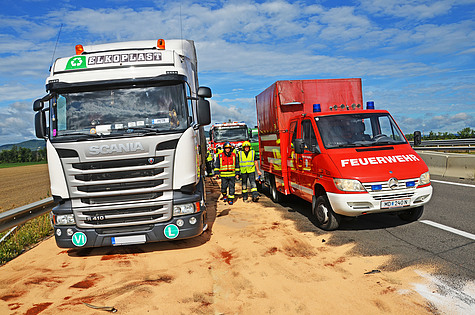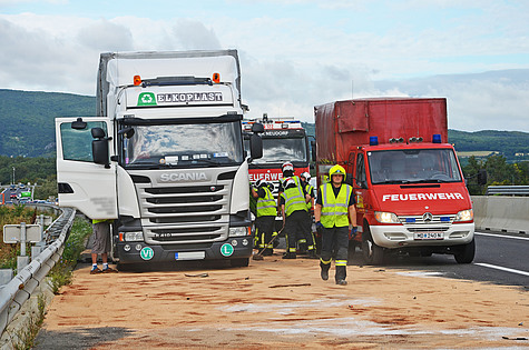 Durch die Wucht des Aufpralles wurde bei einem der Lkw der Treibstofftank aufgerissen und 400 Liter Dieselkraftstoff breitete sich auf den Fahrspuren der Autobahn aus.