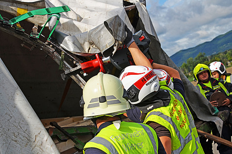 Da die Bordwände des verunfallten Sattelaufliegers komplett instabil waren, mussten diese mit mehreren Zurrgurten gesichert werden. Herausragende Metallteile wurden mit der hydraulischen Rettungsschere abgeschnitten.