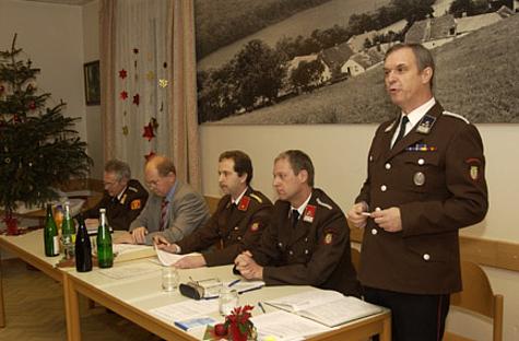 Bei seinem Rückblick als Kommandant ging OBI Karl Valenta sowohl auf das Jahr 2005, als auch auf die Entwicklungen in den letzten fünf Jahren ein. Ziel der Feuerwehr sei immer der Dienst am Nächsten und die ständige Erreichbarkeit, betonte OBI Valenta. Den Blick auf die Zukunft gerichtet, definierte der Kommandant als Ziel, Feuerwehrleuten ein Wohnen in der Gemeinde zu ermöglich. Inzwischen haben bereits 13 Aktive ihren Hauptwohnsitz nicht mehr in Biedermannsdorf. 2006 wird ein Tanklöschfahrzeug 4000 als Ersatz für das 23 Jahre alte TLF 2000 bestellt.