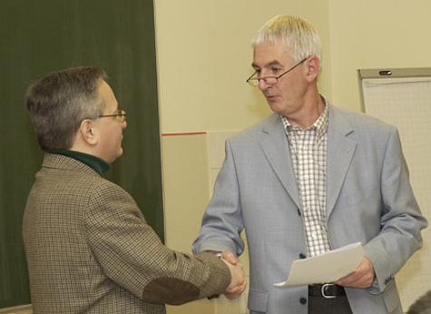 An Bürgermeister Ing. Johannes Unterhalser, der an diesem Abend gewissermaßen im Kreise "seiner" Feuerwehr Geburtstag feierte, überreichte Kommandant OBI Valenta zu Beginn der Mitgliederversammlung ein Geburtstagsgeschenk.