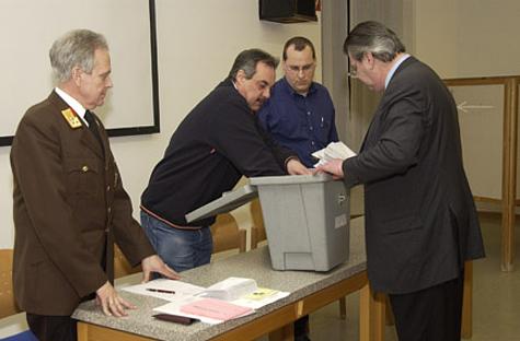 Mit einem klaren Votum bestätigten die Feuerwehrleute in Laxenburg ihren bisherigen Kommandanten HBI Andreas Heidenreich. Er erhielt 39 Stimmen, auf den bisherigen Kdt. Stv. Ing. Thomas Hartl, der sich gleichfalls als Kandidat zur Verfügungs gestellt hat, entfielen 19 Stimmen.
