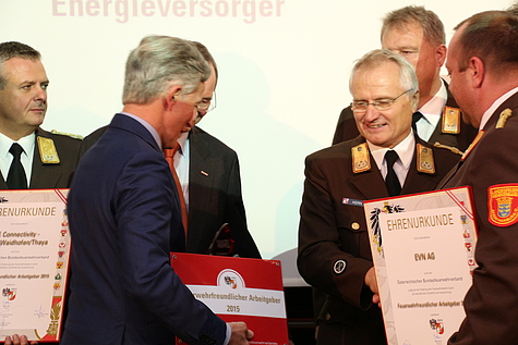Die heurige Vergabe des gleichnamigen Awards fand am 2. November 2015, in den Räumlichkeiten der Wirtschaftskammer Österreich, statt. Im festlichen Rahmen eröffnete ÖBFV-Präsident Albert Kern den Galaabend und Wirtschaftskammerpräsident Dr. Christoph Leitl begrüßte, als Hausherr, die zahlreichen Gäste im Saal. Im Anschluss durften bundesweit 16 Unternehmensvertreter die Ehrung zum „feuerwehrfreundlichen Arbeitgeber 2015“ entgegennehmen. Für das Bundesland Niederösterreich ging der Award an zwei große Konzerne. An die Firma TE Connectivity aus Waidhofen an der Thaya und an die EVN AG.
