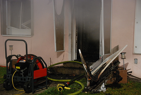 Unverzüglich begann ein Atemschutztrupp mit einem C-Rohr mit die Löschmaßnahmen im Vorgarten. Bei der weiteren Lageerkundung fand Einsatzleiter OBI Roman Janisch den Wohnhausbesitzer verletzt im hinteren Garten vor. Dieser wollte aufs Nachbargrundstück flüchten, als er zu sturz kam. Für seine Katze kam leider jede Hilfe zu spät.