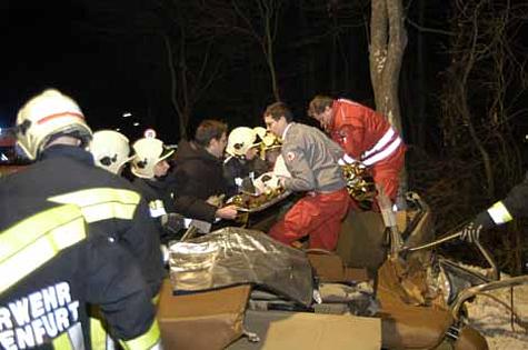Aus dem Pkw rettete die Feuerwehr Breitenfurt den eingeklemmten Lenker und ein achtjähriges Mädchen, die Tochter einer Bekannten des Lenkers. Das Mädchen saß auf einem Kindersitz im Fond des Wagens, durch die Verformung des Autos beim Anprall wurden die Beine des Kindes zwischen Vordersitz und hinterer Sitzbank eingeklemmt. Auch der Lenker war im Fußbereich eingeklemmt worden. Um einen Zugang zu den Verletzten zu schaffen, durchtrennte die Feuerwehr sämtliche Dachsteher des Pkw und hob das Dach komplett vom Fahrzeug ab. Das Kind war ansprechbar, hatte aber augenscheinlich Beinverletzungen erlitten. Da auch die Gefahr einer Rückgradverletzung bestand, wurden die Rettungsmaßnahmen mit äußester Sorgfalt vorgenommen. Der Notarzt übernahm das Kind dann zur Erstversorgung. Zuvor war schon der Lenker mit Verletzungen unbestimmten Grades aus dem Fahrzeug befreit und dem Roten Kreuz übergeben worden. Im Bus befanden sich zum Unfallszeitpunkt nur zwei Fahrgäste und der Lenker. Sie alle blieben unverletzt. Feuerwehr-Einsatzleiter Hauptbrandinspektor Erwin Rautner, Kommandant der Feuerwehr Breitenfurt, spricht von einem kleinen Wunder: "Der Linienbus weist schwerste Beschädigungen auf. Ein Glück, dass der Buslenker nicht eingeklemmt wurde, und auch die anderen Fahrgäste unversehrt geblieben sind!" Die Freiwillige Feuerwehr Breitenfurt war mit 32 Mann und sechs Fahrzeugen im Einsatz.Bildautor: Martin Hofbauer/Pressestelle BFK Mödling