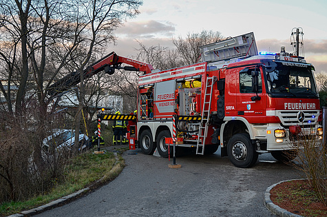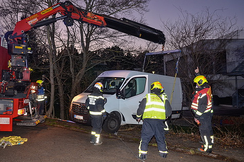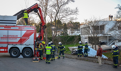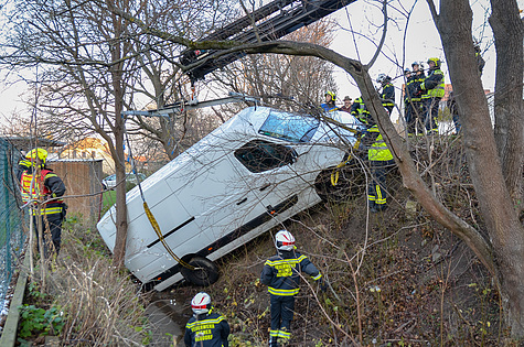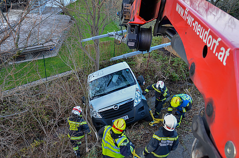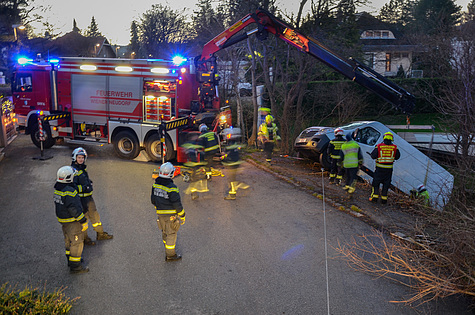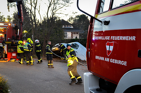 Die durch die Bezirksalarmzentrale alarmierte Freiwillige Feuerwehr Brunn am Gebirge traf kurz vor 14 Uhr am Unfallort ein. Nach erster Erkundung, Sicherungsmaßnahmen und Befragung des unverletzten Lenkers wurde zur Bergung des abgestürzten Fahrzeuges um die Unterstützung durch einen leistungsstarken Ladekran ersucht.