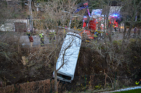 Erst nach mehreren Hubvorgängen war es den beiden Feuerwehren möglich, den Transporter zurück auf die Fahrbahn zu heben. Für die Dauer der Bergung wurde die Brunnerbergstraße durch die anwesende Polizei gesperrt.