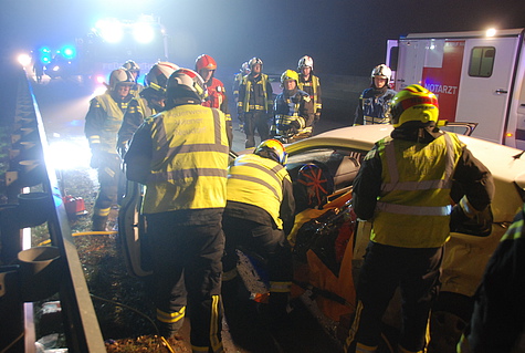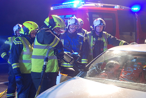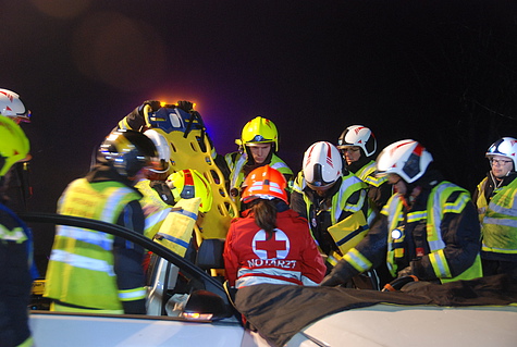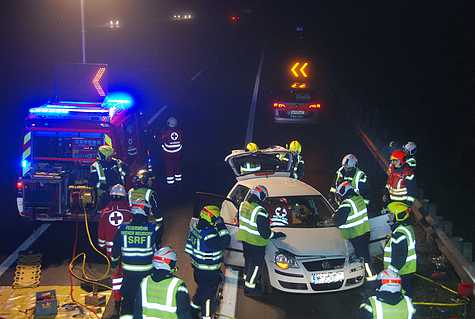Eine ältere Dame war nach einem Unfall zwischen 1. und 2. Fahrspur in ihrem Fahrzeug eingeschlossen. Mittels hydraulischem Rettungsgerät wurde nach Rücksprache mit dem Notarzt das Dach entfernt, um eine schonende Rettung zu ermöglichen.
